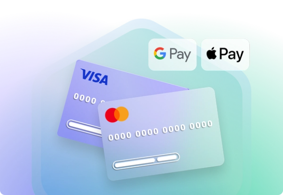 Buy crypto with credit card, Apple Pay, Google Pay, and bank transfer.