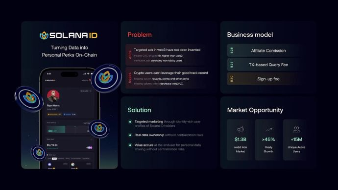 - Clear Business Model: Solana ID is transforming the ad-based internet model: Users upload and link their data into profiles, enabling Web3 businesses to target their ideal audience and pay them directly. This allows users to earn rewards for their data while businesses gain transparency on their customer acquisition costs (CAC).