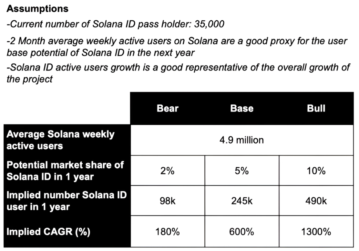 Under the below set of assumptions (source: tokenterminal), we believe that Solana ID could attract between 98,000 to 490,000 unique users to its platform in the next year. If we assume that a significant portion of the intrinsic value of Solana ID is directly related to the growth of its user base, then this appears to be an interesting opportunity.