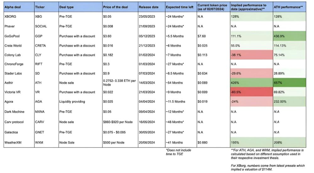 Based on this, we note that an equal-weighted portfolio in every alpha deal would yield a performance to date of approximately 85% and a median performance of 55%. On the other hand, using ATH (All-Time High) values, the average performance rises to 217% with a median of 128%.