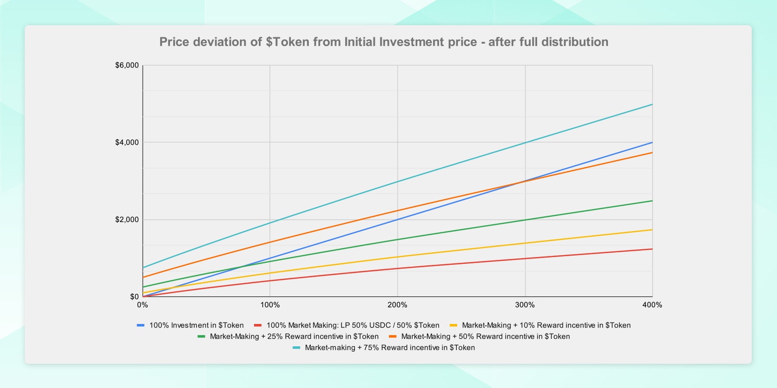 - Token incentives: Under a 100% market-making structure, the upside potential is more capped than a classic VC-type deal. To compensate for that, projects will offer a reward of its tokens to investors. This incentive program aims to ensure that the terms of the deal provide an upside potential that is as good, or even better, than if it were conducted in a classic VC-style manner. Again, from the graph below, we see that for a 200% price performance, a market-making deal with a 50% token reward leads to a profit of $2,323 against $2,000 if it were conducted as a classic VC deal. However, the payoff of the market-makers is slightly concave, which means that for a high return on investment, a linear payoff is best suited.