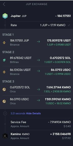 Quite simply, the Smart Engine shows you the trade route taken for every exchange you make in the SwissBorg app. Take this trade from Jupiter (JUP) to Kamino (KMNO) for instance. The trade route went via 2 centralised exchanges (CEXs) and a decentralised exchange (DEX) to find you the best price and with minimal slippage, which occurs when liquidity is low. You can see the exact trade and rate paid at each point in the journey, and with the trade time taking just 3.21 seconds to do all of that!