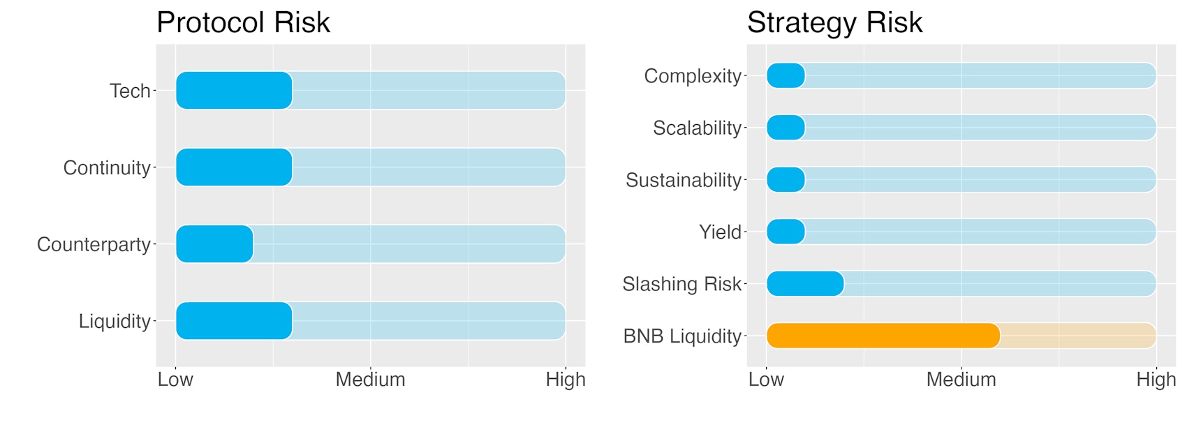 The SwissBorg Risk Team ranks BNB staking as a Low risk investment, one for an investor with a good understanding of DeFi and yielding, who is willing to take on little risk in exchange for a fair reward on BNB.
