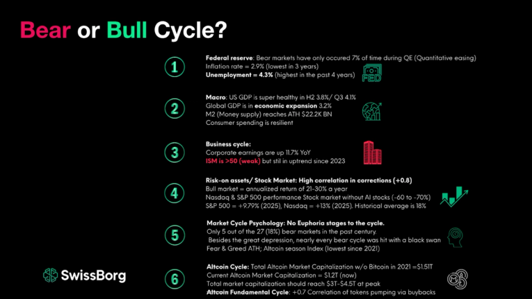 Crypto does not live in a vacuum. During corrections, the correlation between stocks and crypto is very high, around 0.8. So it matters a lot whether equities are in a real bull market or not.
