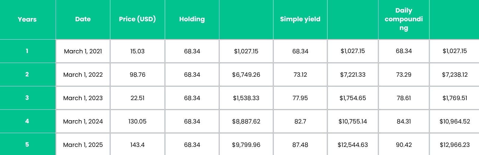 See how daily compounding transforms returns: over five years, your total value can be about 40% higher than simply holding Solana.