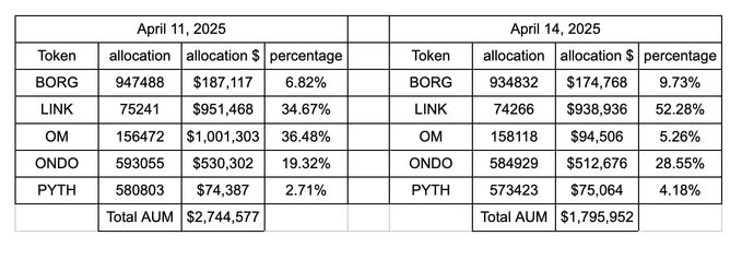 Before the OM incident, the RWA Bundle was delivering strong performance, consistently outperforming its benchmark (an equally weighted portfolio of all RWA-sector tokens listed on SwissBorg). Following the crash, the Bundle is now slightly underperforming. As of 15.04.25, its performance stands at -46.95%, compared to -42.09% for the benchmark.