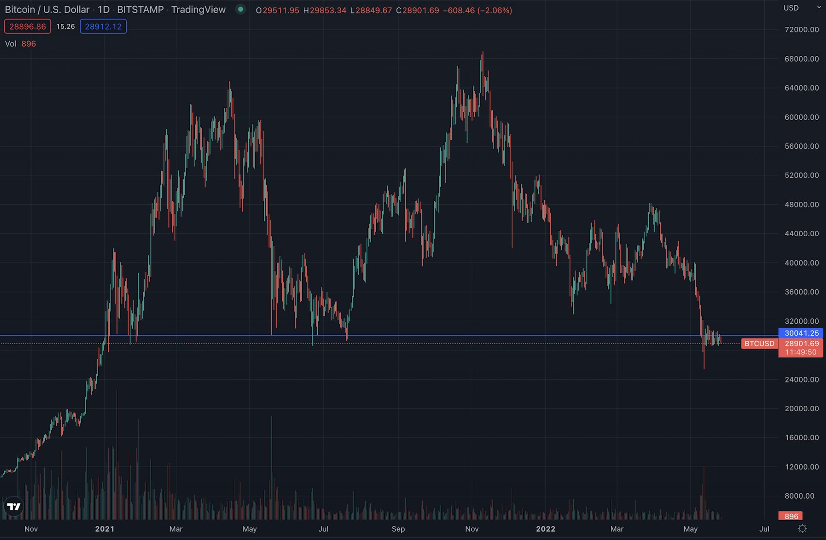 The crucial technical and psychological support level is at 30k, and with the influx of negative news as well as the overall hit to the crypto market caused by the downfall of Luna and UST, the short-term outlook is not extremely optimistic.