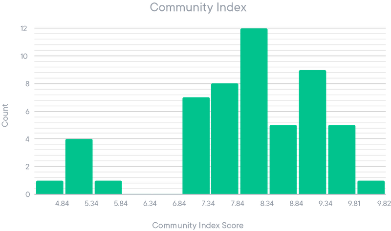 Each of these metrics represents a different element of our ecosystem, and the subscores combine to create a Community Index score between 0-10.