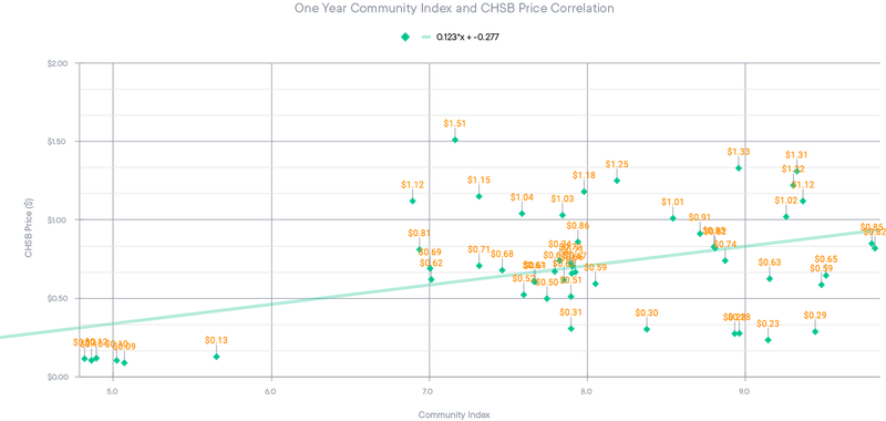 We can see that there is moderate correlation between the Community Index and the price performance of CHSB over the period of a year. In the chart below, we can see that in the majority of cases, when the price of CHSB is strong, the Community Index score is above 7.0.