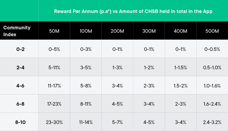 As mentioned earlier, the Community Index was designed to reward our community members by tying their activity and loyalty to the rewards they could earn through the CHSB Yield Program.