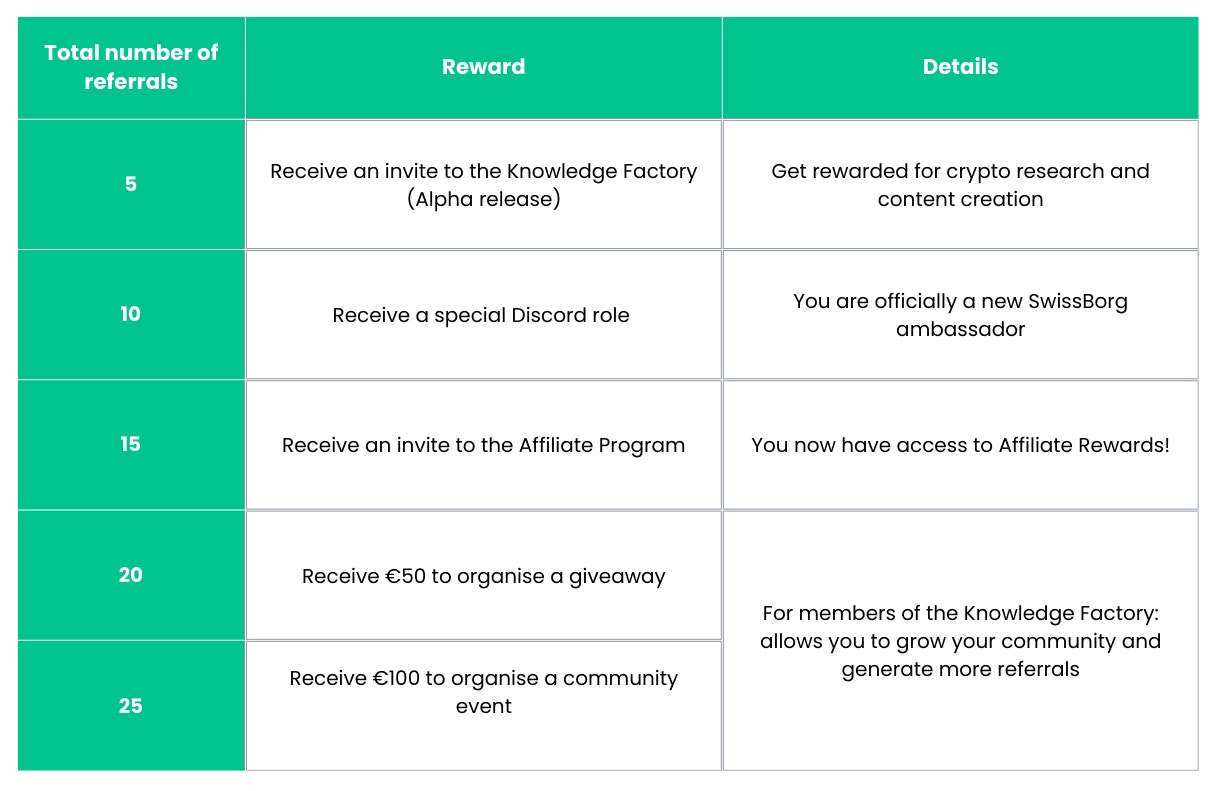 Every time you make a successful referral in the SwissBorg app, you will progress towards the next milestone giving you a new reward to unlock, as follows: