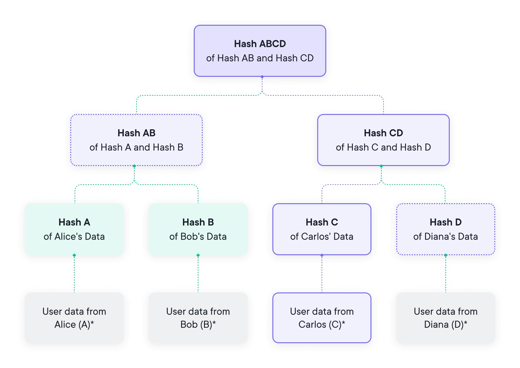 At the top, the root element ( and yes we know tree roots are at the bottom of the tree in the ground, but go with it ) contains a hash that has essentially aggregated all underlying data.