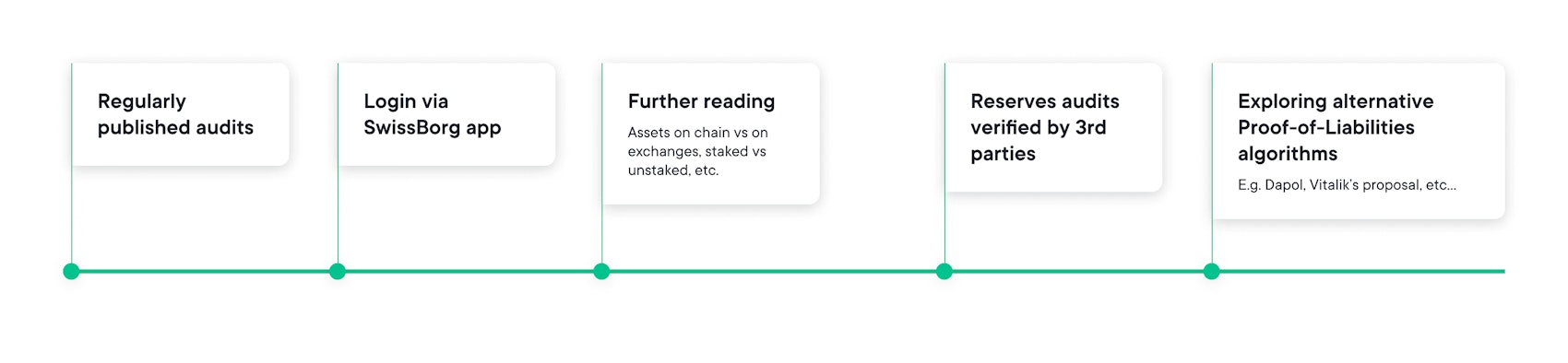 Please note that the information on users' liabilities provided by our proof of liabilities protocol is recorded from SwissBorg's internal ledger system. SwissBorg shall not be held liable for any misstated balances resulting from any mistake or error in the ledger. It does not provide information on other liabilities or risks of the company. This article is intended for general guidance and informational purposes only and does not constitute any offer to the public of virtual assets or financial instruments, financial advice, investment advice, or any other type of advice, and should not be interpreted or understood as any form of promotion, recommendation, solicitation, offer or endorsement to (i) buy or sell any product, (ii) carry out transactions, or (iii) engage in any other legal transaction. Neither SwissBorg Solutions OÜ nor its affiliates, make any representation or warranty or guarantee as to the completeness, accuracy, timeliness or suitability of any information contained within any part of this article, nor to it being free from error.