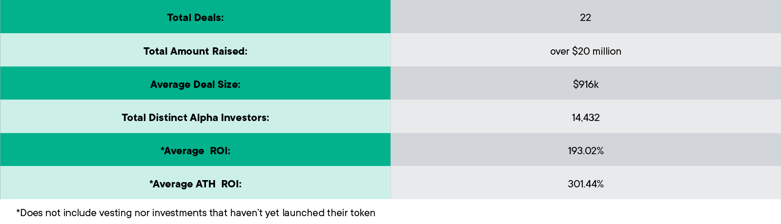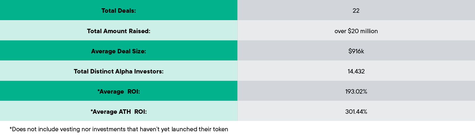 The purpose of Alpha Deals is to give our users the privilege to invest in projects vetted by a team of experts. In our opinion, ideally, users would invest a comfortable amount into many projects and diversify their portfolio. Let’s see what would happen if the user invested $100 into every Alpha token deal.
