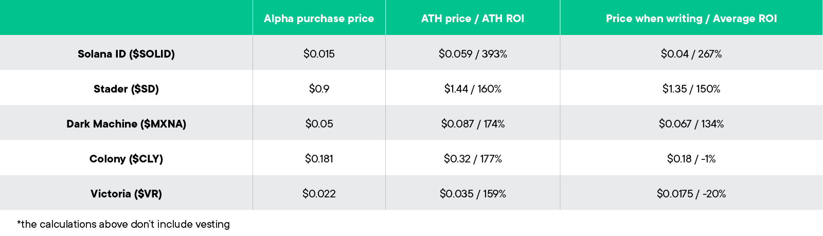 Below is a quick guide to the current vesting schedules of all Alpha Deals done until the end of 2024.