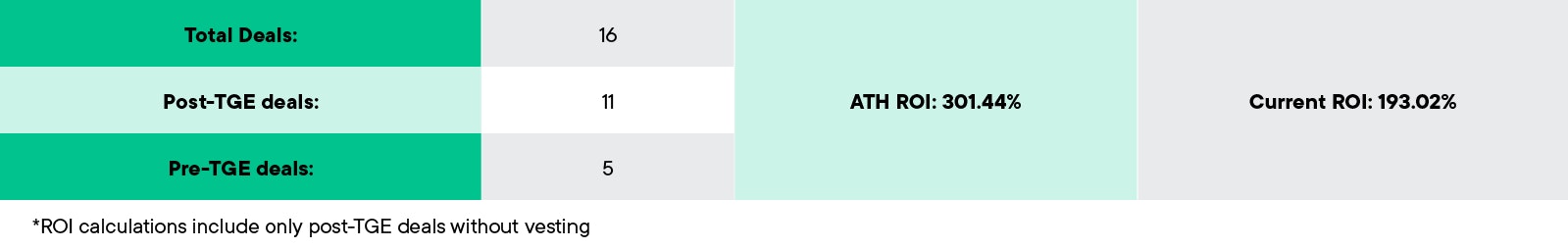 As you can see, there were 16 token deals brought to SwissBorg Alpha so far, 11 of them already had TGE, we believe the other 5 are close to it. If the user spent $100 on all the post-TGE deals they would have invested $1,100. At the time of writing this would be worth $2,123, almost a 2x of their investment.