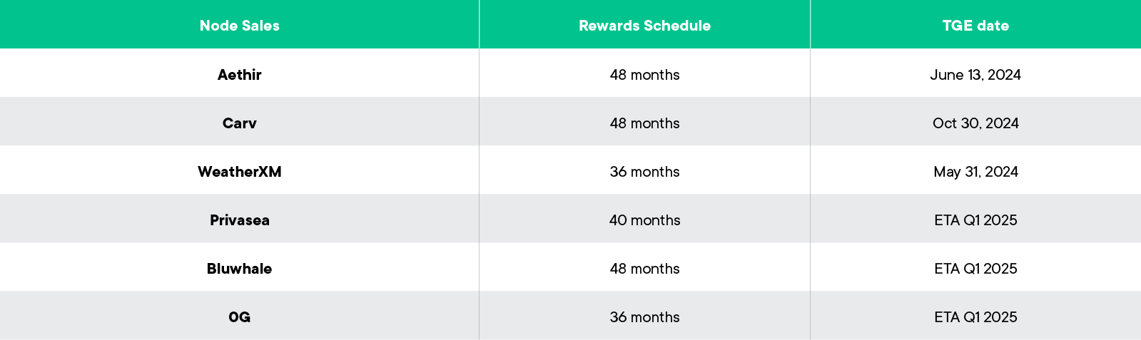 The last three node sales that we did were Privasea, Bluwhale & 0G and at the time of writing, they are pre-TGE, although some of the nodes are already live and generating rewards. We expect some of these to do their TGE soon and we are working closely with their teams so that we can list their tokens as soon as they are live.