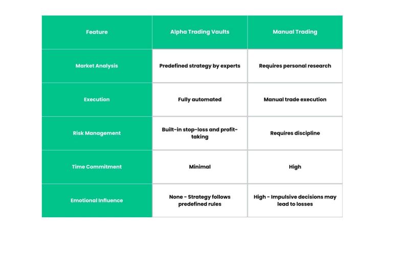 Unlike manual trading, where investors must monitor the market, identify trends, and react in real-time, Alpha Trading Vaults offer a set-and-execute approach, reducing complexity and eliminating emotional decision-making.