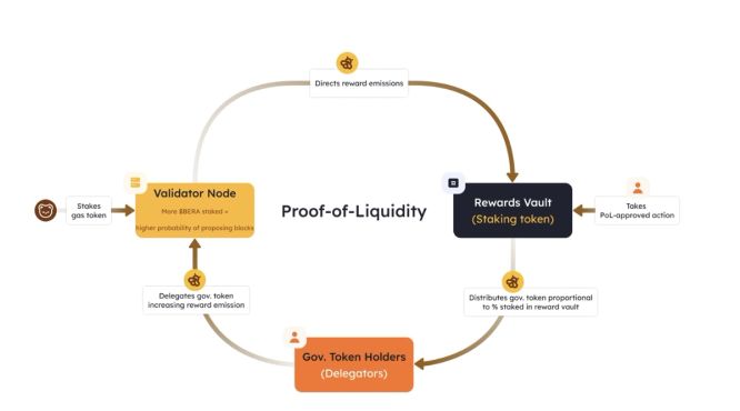 - Two-Token Economy: Proof-of-Liquidity separates the token responsible for gas and security from the token used to govern chain rewards and economic incentives. Berachain operates with $BERA (gas token) and $BGT (governance token) to create a meaningful economic alignment between previously isolated groups.
