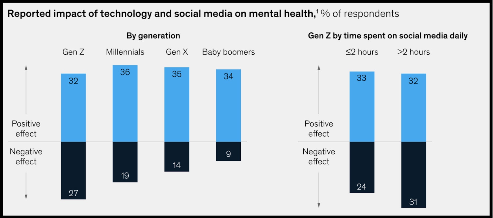 According to Mckinsey, “studies of young adults and their social media use have shown an inverse relationship between screen time and psychological well-being, with higher utilisation associated with poorer well-being.”