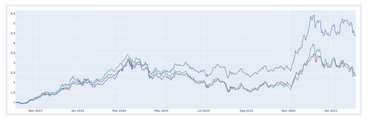 In Blau siehst du den Backtest des trendfolgenden Algorithmus-Bundles. Das neue Modell ist seit der letzten Umverteilung, die Anfang Februar stattfand, live.