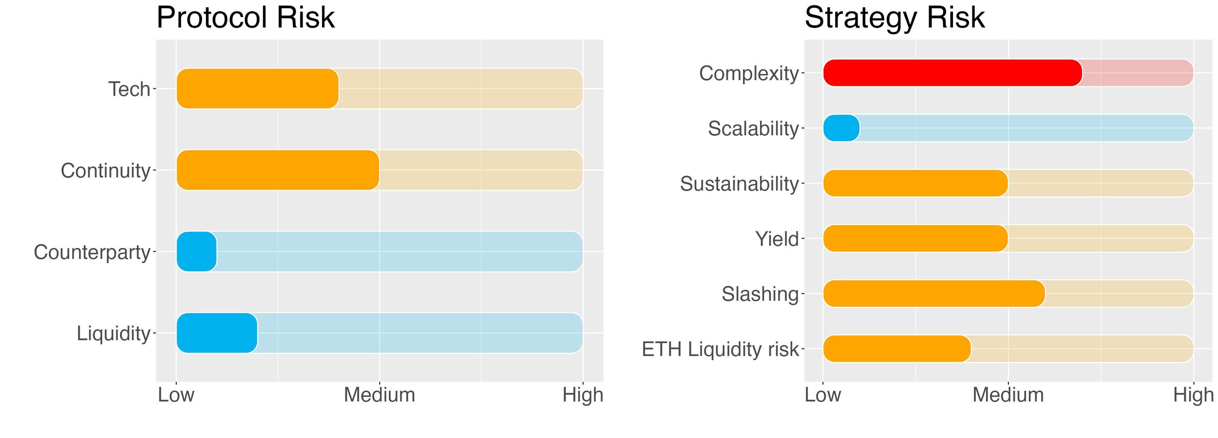 Sowohl Kiln als auch EigenLayer haben in unserer technischen Due-Diligence-Prüfung eine "grüne" Bewertung erhalten, aber da EigenLayer nicht kampferprobt ist, stufen wir das technische Risiko auf (die untere Grenze von) mittel ein.