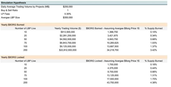 - Verbrennen von BORG: Jedes Mal, wenn ein Umtausch mit dem TOKEN/BORG LP durchgeführt wird, wird eine Gebühr vom Umtausch abgezogen. Die Gebühr wird entweder in TOKEN oder BORG erfasst, je nachdem, ob jemand TOKEN kauft oder verkauft. Wenn der LP verbrannt wird, werden auch die eingezogenen Gebühren dauerhaft verbrannt. Dieser Prozess führt zu einer permanenten Deflation für beide Token.