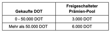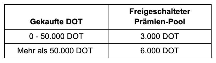 Der Prämienpool wird auf Grundlage der Community-Ziele freigeschaltet. Je mehr DOT-Token gekauft werden, desto mehr Belohnungen werden freigeschaltet!