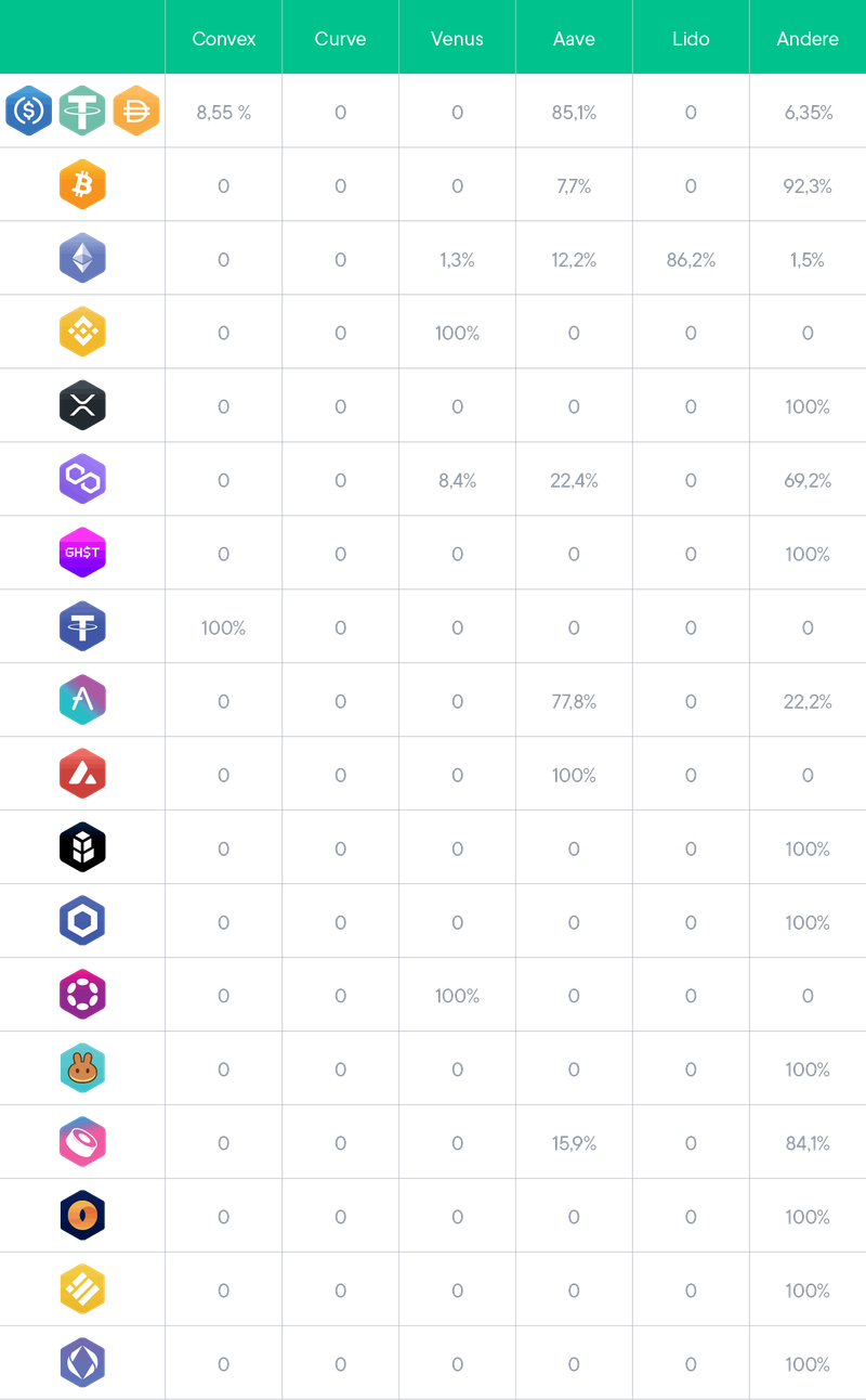 Die Smart Yield Wallets blieben relativ stabil. Blockchain-native Token gewinnen wieder etwas an Aufmerksamkeit. Das liegt daran, dass sie die stabilste Quelle für Erträge sind, die am häufigsten verwendeten Token in ihren jeweiligen Blockchains sind und weniger riskante Optionen darstellen. Der einzige Token, der diesem Trend nicht folgt, ist ETH. Dies liegt vor allem daran, dass sich die Angst vor möglichen Liquiditätsproblemen der ETH Yield Wallets verbreitet hat. Wir möchten daran erinnern, dass diese Probleme auch andere Branchenteilnehmer aufgrund mangelnder Vorsicht, übertriebener Gier und Leverage-Positionen betroffen haben. Der Smart Yield Optimizer war stets auf ein sehr gutes Risikomanagement eingestellt und steht in keiner Weise in Verbindung mit den Akteuren, die versagt haben.
