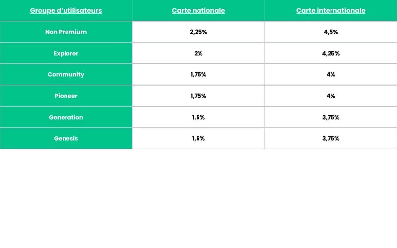 Tout paiement par carte comporte également des frais. Chez SwissBorg, nous valorisons la transparence et communiquons ouvertement les frais associés à nos services. Les frais de transaction liés aux approvisionnements par carte sont d’un minimum de 5 EUR pour tout montant, et, pour les niveaux Premium, ces frais sont calculés comme décrit dans le tableau ci-dessous.