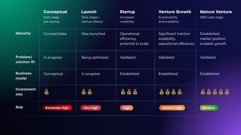 Le tableau ci-dessous montre, au cours des différentes étapes de la croissance d'un projet, son niveau de maturité (également en termes de modèle d'entreprise et de taille de l'investissement) et les risques inhérents à l'investissement à chaque étape.