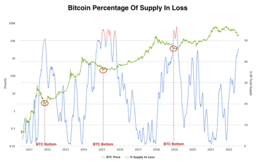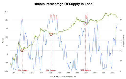 Bien que les indicateurs techniques signalent un possible creux du marché, les indicateurs sur la chaîne montrent que, sur la base du comportement passé, nous n'en sommes pas encore là. Le Bitcoin Percentage Supply in Loss (pourcentage d’offre de Bitcoin en perte) montre que nous avons assisté à un renversement de tendance lorsque la ligne bleue devient rouge (graphique ci-dessous), que plus de 50 % de l'offre est à perte et que les détenteurs refusent de vendre.