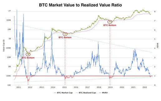 La MVRV (market-value-to-realised-value, valeur du marché comparée à la valeur réalisée), représentée par la ligne bleue dans le graphique ci-dessous, est un rapport entre la capitalisation boursière du Bitcoin (ligne verte) et sa capitalisation réalisée (ligne rose). La capitalisation réalisée correspond approximativement à la valeur payée pour tous les tokens en additionnant leur prix lors de leur dernier mouvement sur la blockchain (base de coût de l'offre). Le ratio MVRV est utilisé pour estimer la " juste valeur " du BTC et vient d'entrer dans le territoire de sous-évaluation (<1) qui a coïncidé avec les creux du marché dans le passé.
