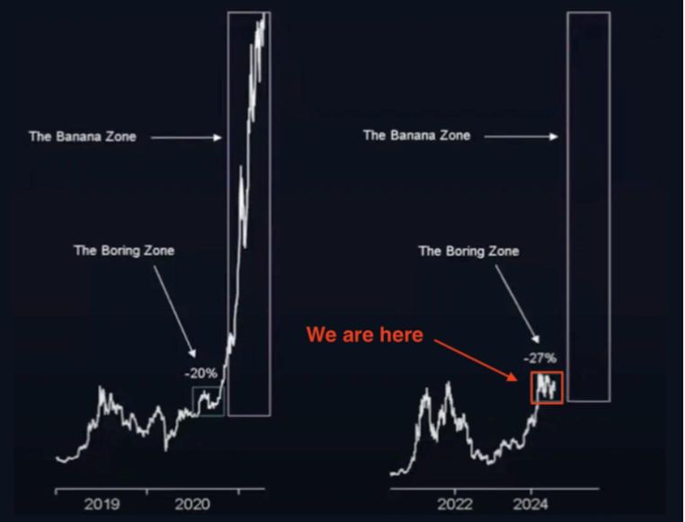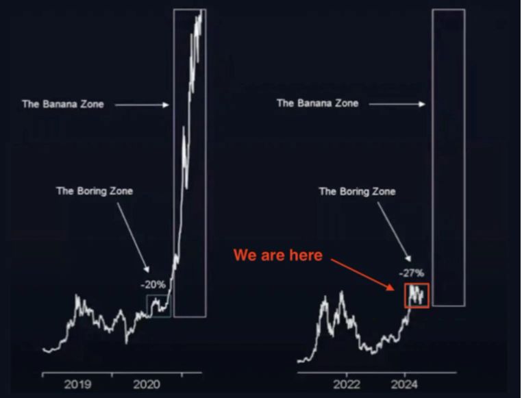 - En août, j'ai entendu de nombreuses personnes parler de la « Banana Zone »... de quoi s'agit-il exactement ? Elle apparaît généralement lorsque le cycle économique atteint son apogée. La phase d'expansion du cycle économique est alimentée par l'afflux de liquidités dans l'économie. Cet afflux est dû à plusieurs facteurs, dont la baisse des taux d'intérêt qui encourage l'emprunt et les dépenses. Et comme nous venons de le mentionner, les étoiles (ou plutôt les banquiers centraux) semblent s'aligner sur une baisse des taux de la Fed en septembre. Ainsi, même si les marchés traversent une période difficile à court terme, les conditions nécessaires à l'avènement de la « Banana Zone » sont tranquillement en train de se mettre en place.