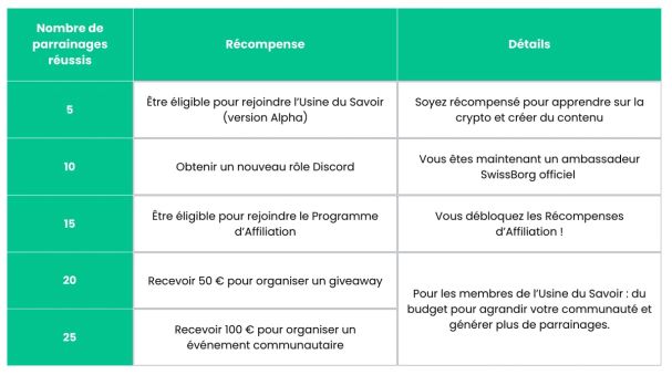 Chaque fois que vous réussissez un parrainage dans l'application SwissBorg, vous passez à l'étape suivante, ce qui vous permet de débloquer une nouvelle récompense, comme suit :