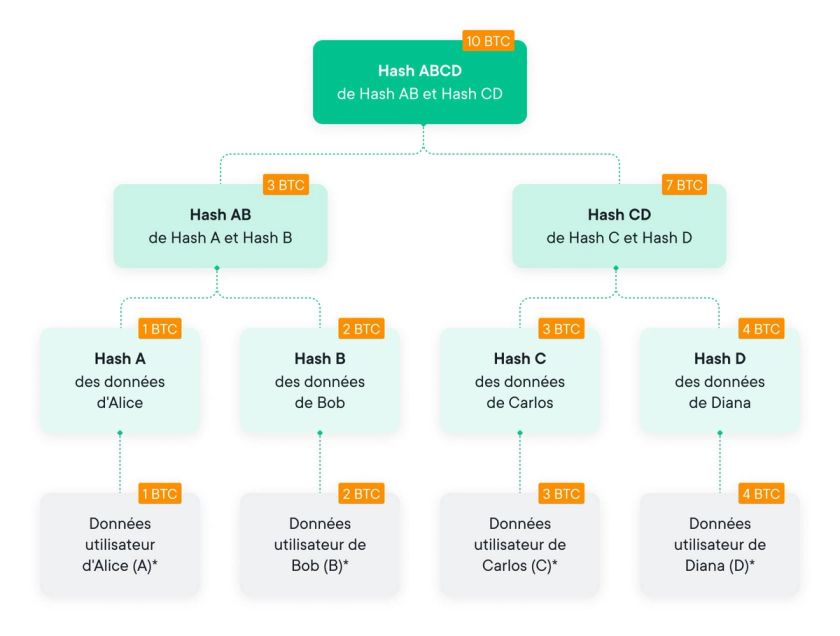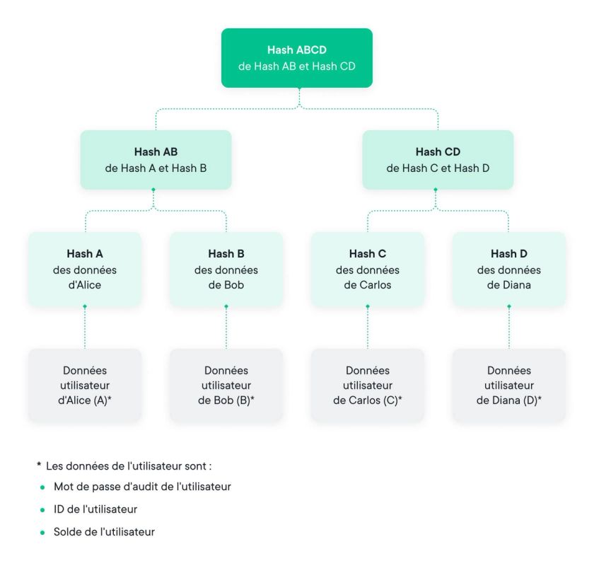 C'est là que les choses deviennent intéressantes. La valeur hachée d'un nœud feuille est obtenue en hachant l'identifiant de l'utilisateur, son mot de passe d’audit et son solde. Le mot de passe de l'utilisateur sert à masquer son ID, afin de protéger sa vie privée. Pour améliorer la sécurité de cette méthode, la position du nœud feuille d'un utilisateur donné est choisie au hasard pour rompre le lien entre un utilisateur et son solde. La valeur hachée de tout autre nœud est calculée en hachant les passifs des nœuds enfants et leurs valeurs digest respectives.