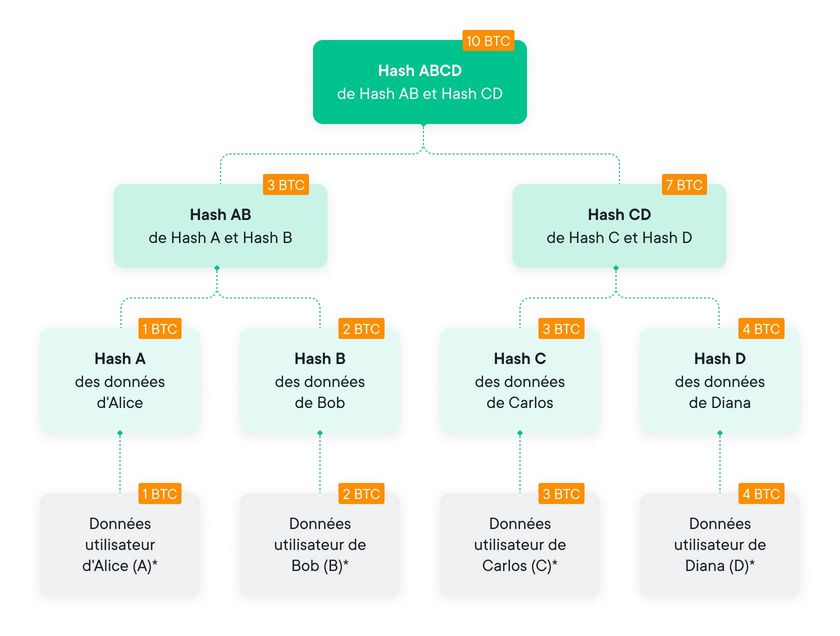 - Données feuilles : nonce feuille, userID, sous-solde