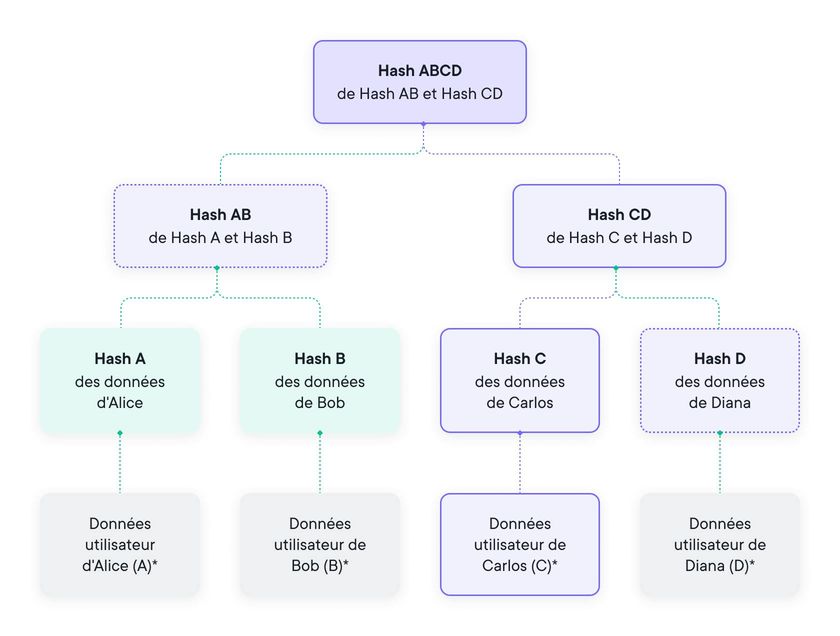 Lorsque vous hachez des valeurs de hachage, une structure commence à se former, dont la taille diminue à chaque itération, ressemblant à des feuilles, des branches et un tronc. Au fur et à mesure de cette séquence, les données ne peuvent être modifiées à aucun moment du processus, sinon tous les hachages suivants changeraient également, ce qui conduit à une structure où les données d'entrée sont protégées contre toute modification.