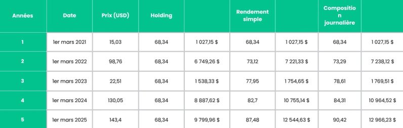 Maintenant, combinez la capitalisation des intérêts avec la croissance du prix de l’actif : Solana ayant été multiplié par 8,5 au cours des cinq dernières années, le staking via Earn aurait porté vos avoirs à environ 11,6 fois votre mise initiale.