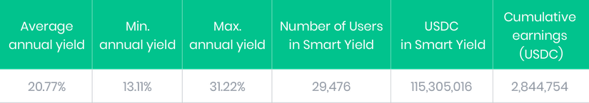Comme mentionné ci-dessus, le ralentissement de l'ETH Smart Yield a été compensé par l'un des mois les plus réussis pour l'USDC Smart Yield. Le rendement offert pour l'USDC continue de se situer en moyenne à plus de 20% par an pour les utilisateurs Premium et cette stabilité offre une opportunité unique de diversification à moyen et long terme. Ainsi, un flux de fonds depuis l'ETH Smart Yield et depuis les profits générés en début d'année ont été injectés dans l'USD Smart Yield.