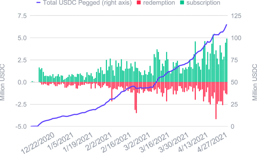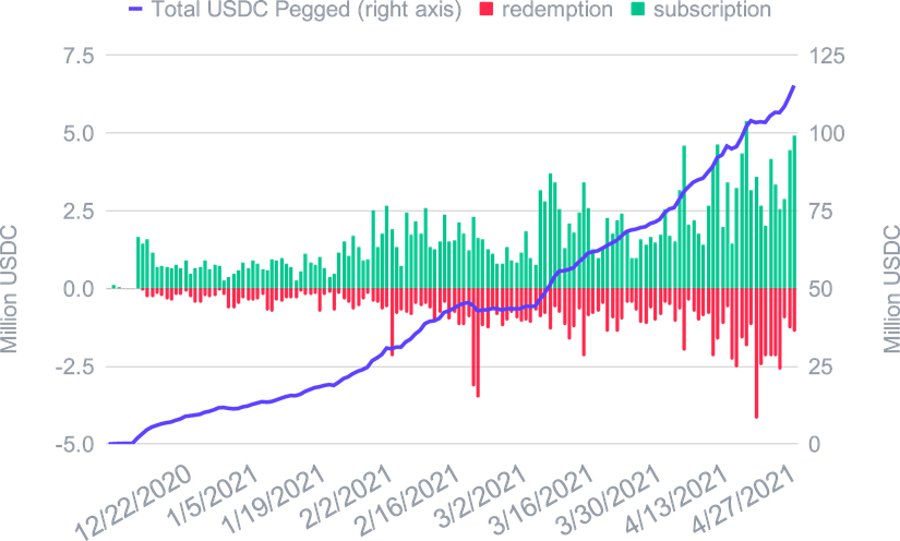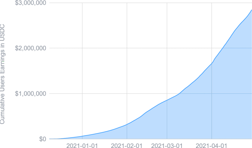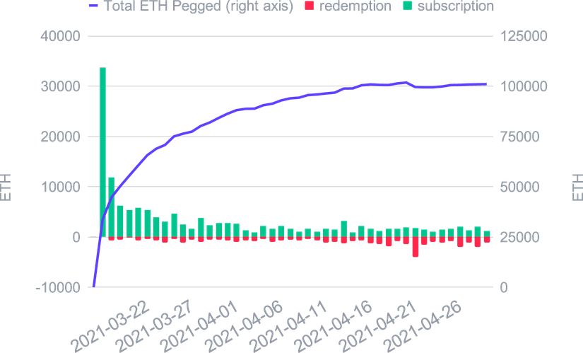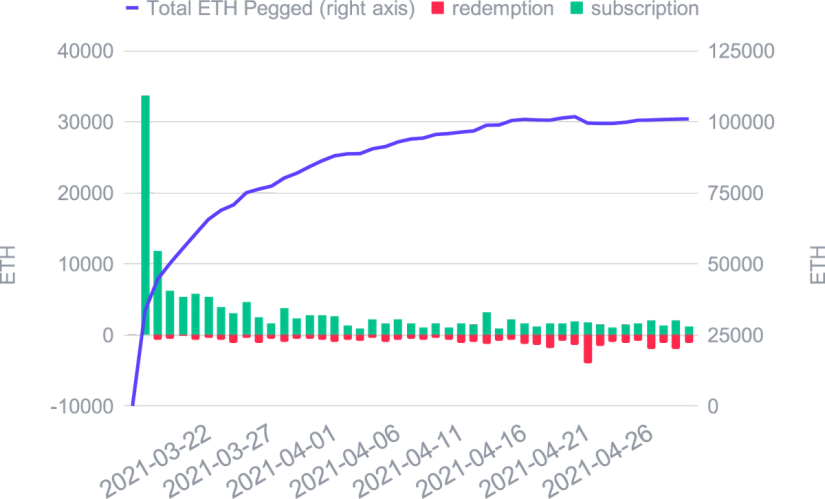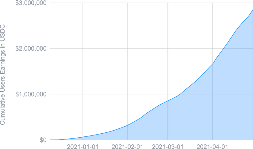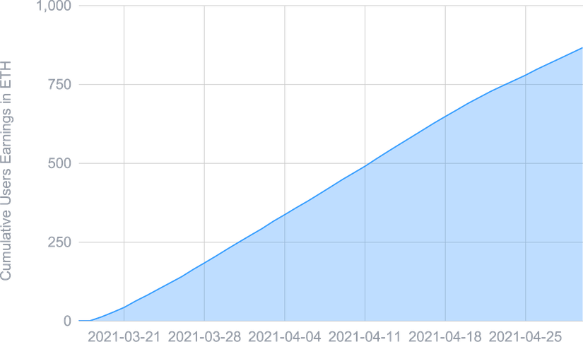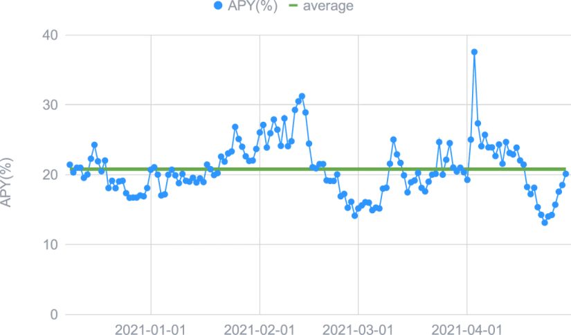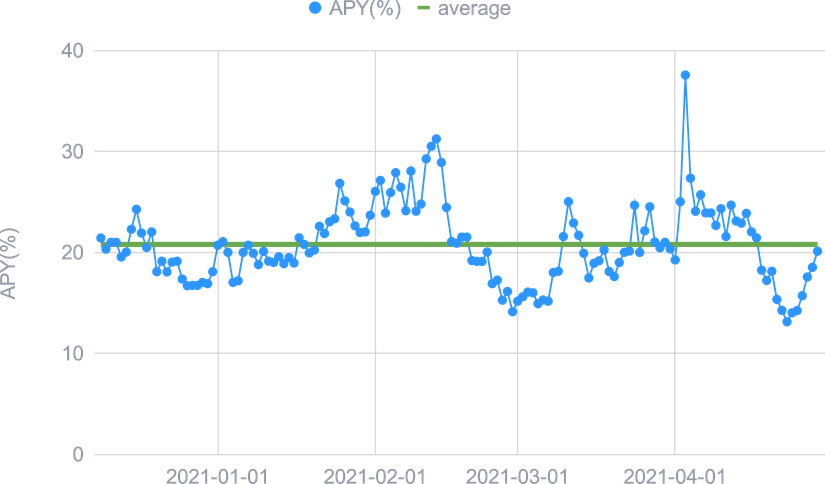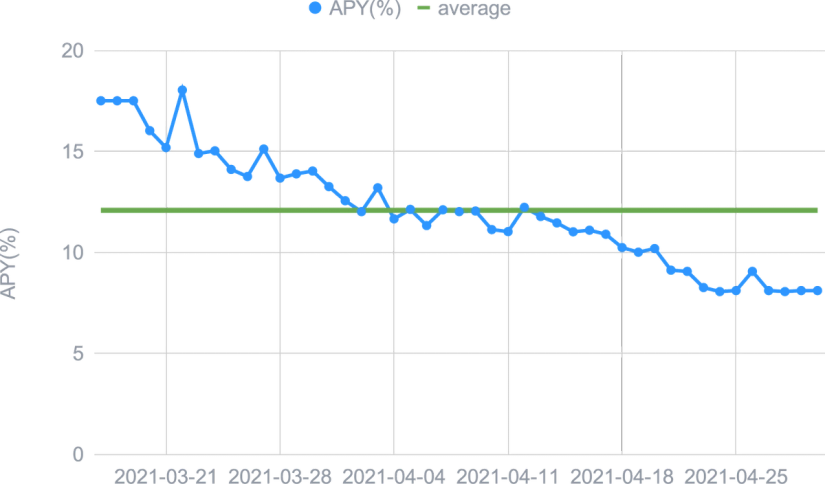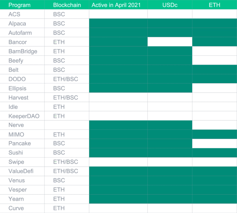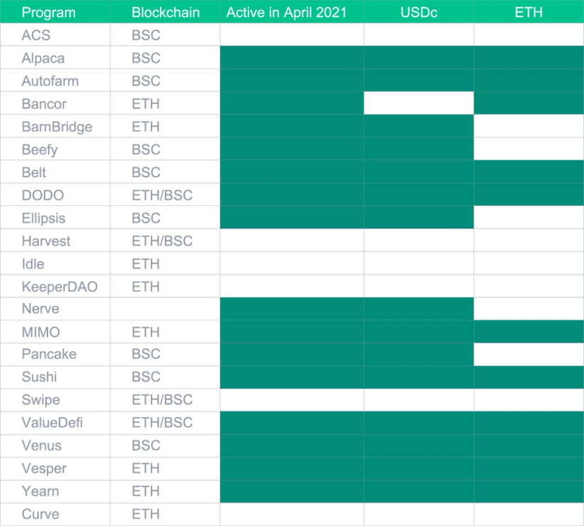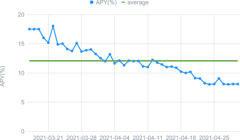 L'expansion de la DeFi a eu peu d'impact sur le l'USDC Smart Yield, et mis à part un ATH au début d'avril, il est resté proche de la moyenne de 2021 jusqu'à présent. Ceci est probablement dû au marché restant haussier et toute TVL concurrentielle supplémentaire est compensée par une appréciation des prix des tokens de récompense. Pour l’ETH Smart Yield, nous avons assisté à une tendance baissière des APYs tout au long du mois. La raison en est une augmentation de la TVL dans la DeFi probablement sous la forme d'actifs non-stablecoins (en particulier ETH), car les gens ont tendance à holder pendant ces marchés haussiers. Ceci est en outre soutenu par un prix croissant de l'ETH, ce qui le rend plutôt un actif à holder. Nous nous attendons à ce que notre programme fournisse des rendements plus élevés dès que le prix de l'ETH se stabilise.