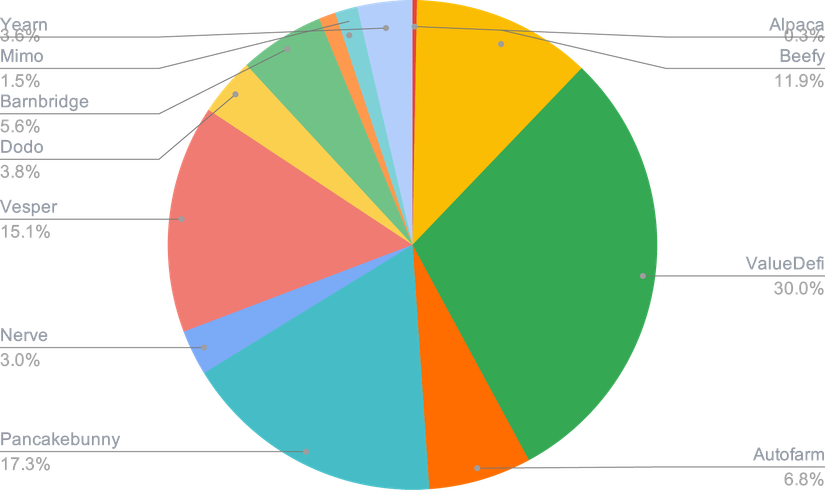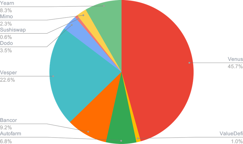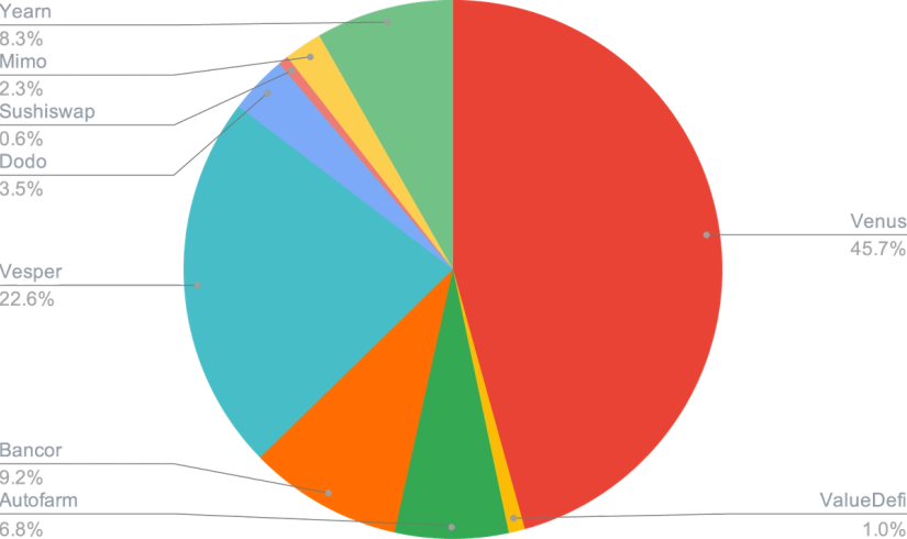 Afin d'obtenir le meilleur rendement possible pour un niveau de risque optimal, l'optimisation de la stratégie de rendement consiste à se diversifier dans de nombreuses applications DeFi et CeFi une fois auditées (Smart Contract et due diligence) afin de limiter les risques.