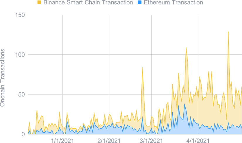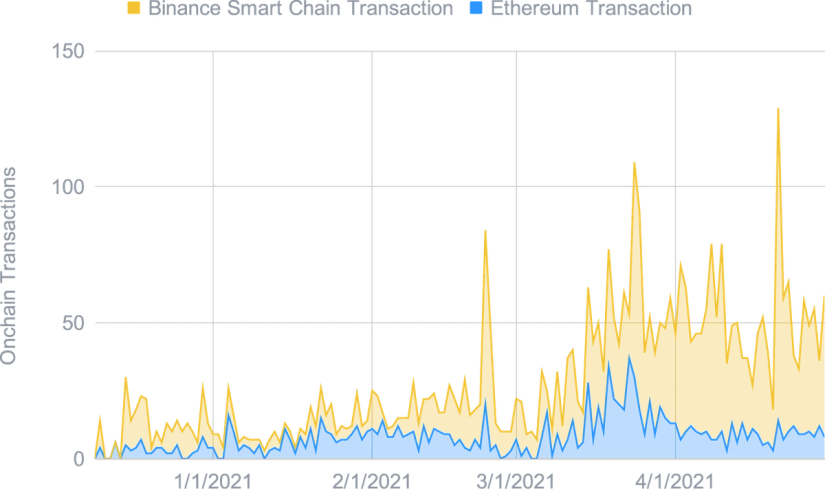 Tout au long du mois d'avril, la DeFi a poursuivi sa croissance impressionnante pour les deux principaux réseaux. La valeur totale verrouillée (TVL) a rejoint le niveau de 65 milliards de dollars pour Ethereum, et 43 milliards de dollars pour la BSC. La DeFi sur la BSC grandit à un taux plus rapide, ayant plus que doublé en un seul mois. Mais il reste toujours à voir si elle peut poursuivre sa croissance si rapide et rejoindre la TVL d’Ethereum, d'autant plus que d'autres réseaux ont également commencé à attirer plus d'utilisateurs.