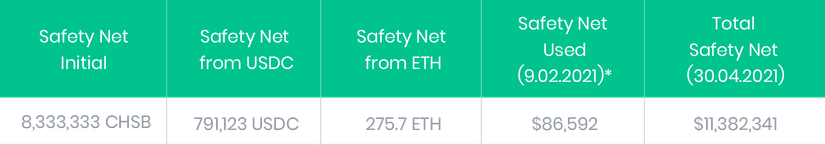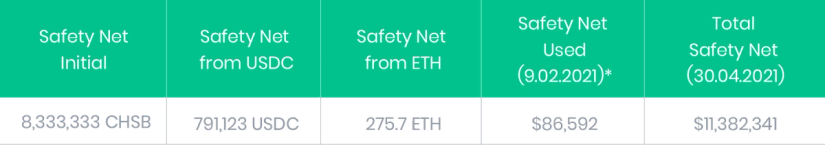 SwissBorg a également mis en place un programme de filet de sécurité de 1 million USD en CHSB (8 333 333 CHSB) pour se protéger contre le risque de smart contract, et nous investissons l'équivalent de 25% des revenus du rendement maximum dans ce programme pour nous assurer qu'il se développe parallèlement aux investissements de notre communauté.