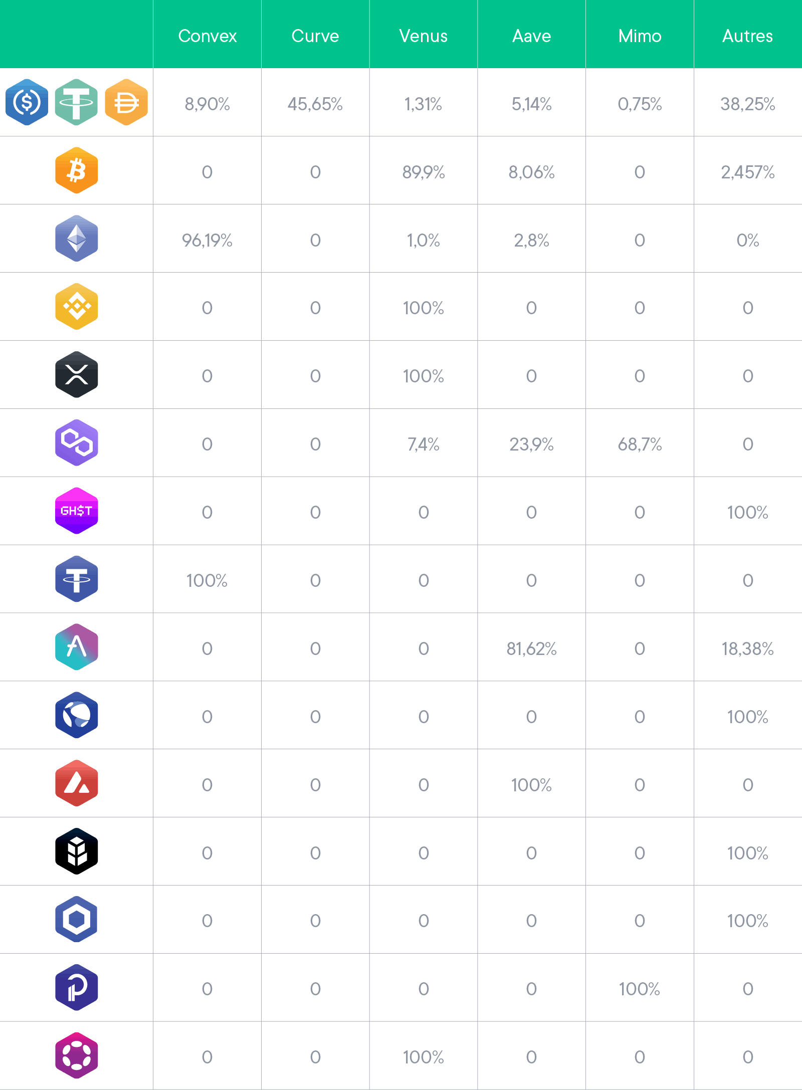 Nous vous rappelons que la sélection de protocoles est effectuée en gardant à l’esprit une stratégie de mitigation des risques. Cela peut avoir des conséquences sur l’APY final. De plus, l’optimiseur ne garde l’exposition que pour l’actif concerné par la stratégie et ne répartit jamais celle-ci sur différents actifs.