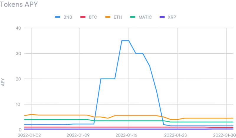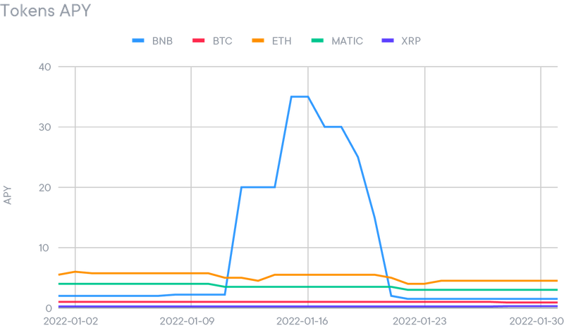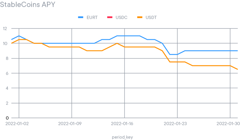 Le tableau suivant résume les mouvements des Smart Yield wallets en janvier. Ils ont été particulièrement volatiles dans le contexte d'un marché baissier, induisant la peur dans le comportement des traders. Cela s'est traduit par une réduction du montant alloué aux portefeuilles Smart Yield dans presque toutes les devises, à l'exception de Matic, USDT et EURT. L'EURT a vu une grande partie de sa traction provenant de la réduction de l'APY des stablecoins USDC et USDT, qui a fini par faire de l'EURT l'actif ayant le meilleur rendement. Activé par plus de 10% des nouveaux utilisateurs, Matic a vu une forte traction, ce qui en fait le deuxième Yield wallet le plus adopté ce mois-ci en proportion.