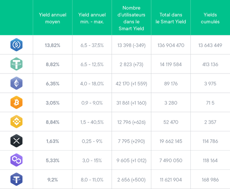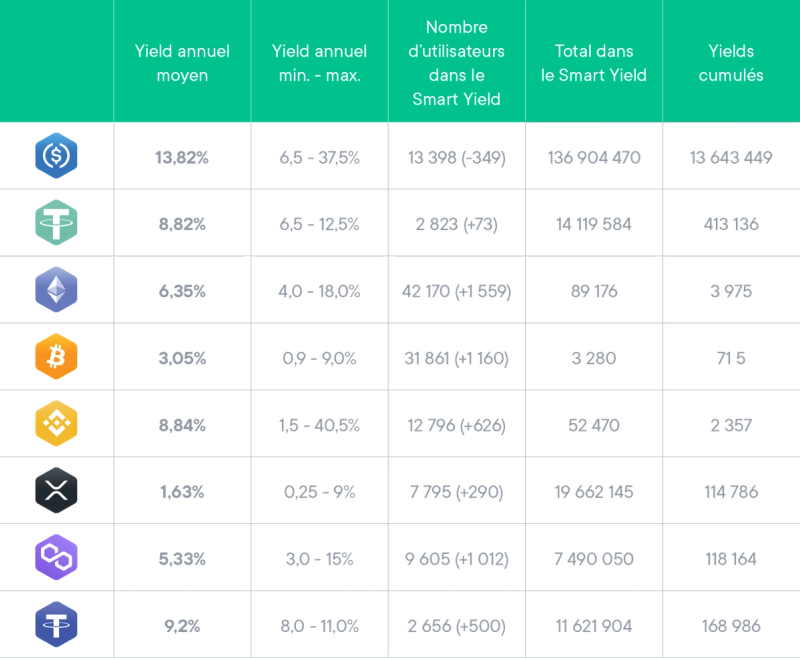 Dans un souci de transparence envers notre communauté, nous recueillons mensuellement nos données pour vous donner un rapport sur les chiffres clés liés aux portefeuilles Smart Yield de SwissBorg.