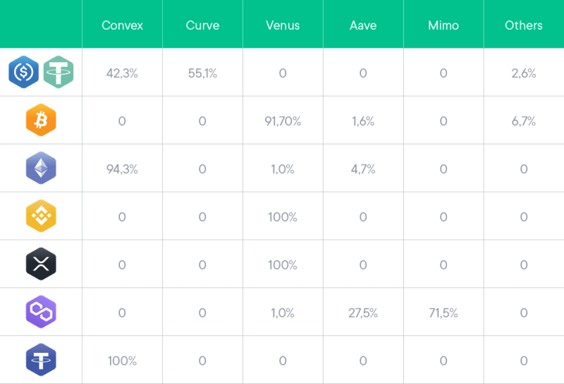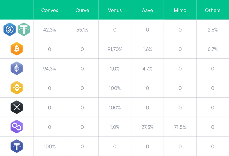 L'allocation est très similaire à celle de décembre, avec Convex et Curve représentant la quasi-totalité de l'allocation des stablecoins. Le BTC a vu un léger changement d'allocation avec une nouvelle stratégie sur Aave.
