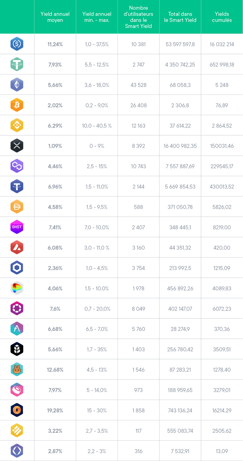 Dans un souci de transparence envers notre communauté, nous recueillons mensuellement nos données pour vous donner un rapport sur les chiffres clés liés aux portefeuilles Smart Yield de SwissBorg.
