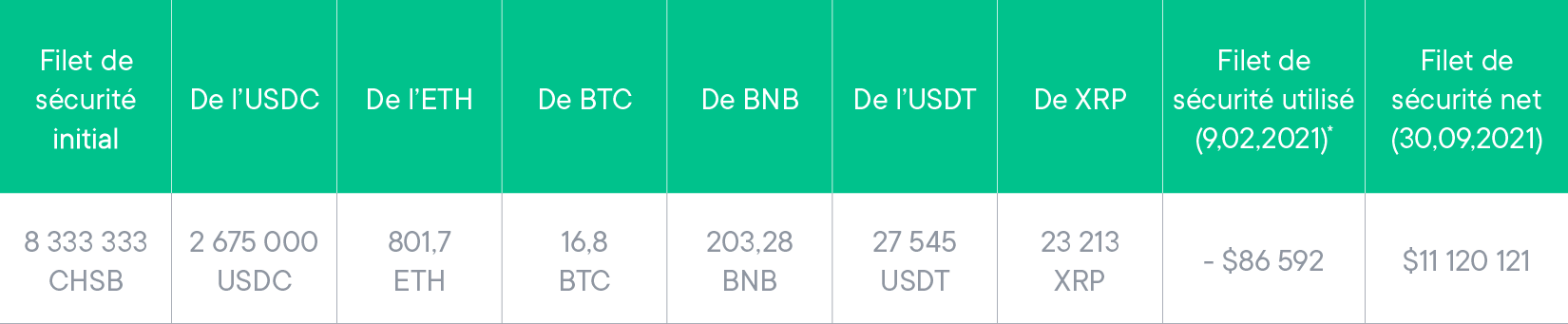 SwissBorg a mis en place un programme de filet de sécurité d’1 million USD en CHSB (8 333 333 CHSB) pour se protéger contre le risque de smart contract, et nous avons toujours investi l'équivalent de 25% des revenus du rendement maximum dans ce programme, pour nous assurer qu'il se développe parallèlement aux investissements de notre communauté.